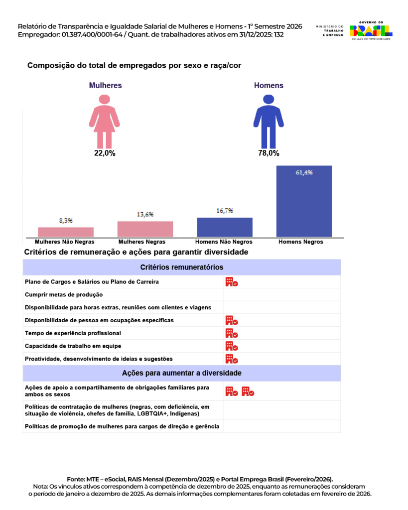 Em cumprimento à Lei de Igualdade Salarial (Lei n° 14.611) e o Decreto n° 11.795/2023. segue relatório de Transparência e Igualdade Salarial de Mulheres e Homens – 1º Semestre 2026.