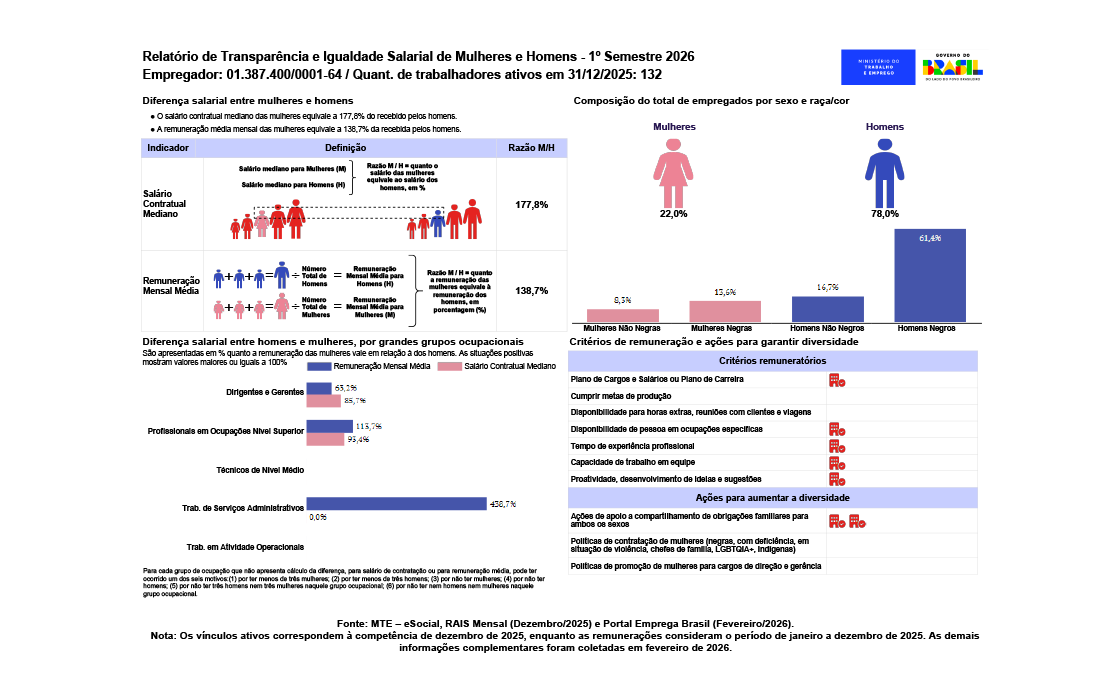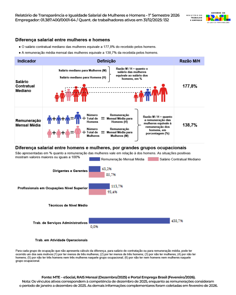 Em cumprimento à Lei de Igualdade Salarial (Lei n° 14.611) e o Decreto n° 11.795/2023. segue relatório de Transparência e Igualdade Salarial de Mulheres e Homens – 1º Semestre 2026.